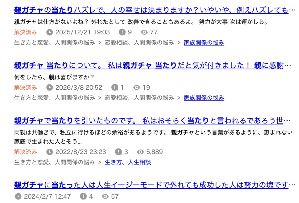 実際に「親ガチャ 当たり」で知恵袋を調べてみると、当たりを感じている人やそれを羨望する人の質問が見られます。